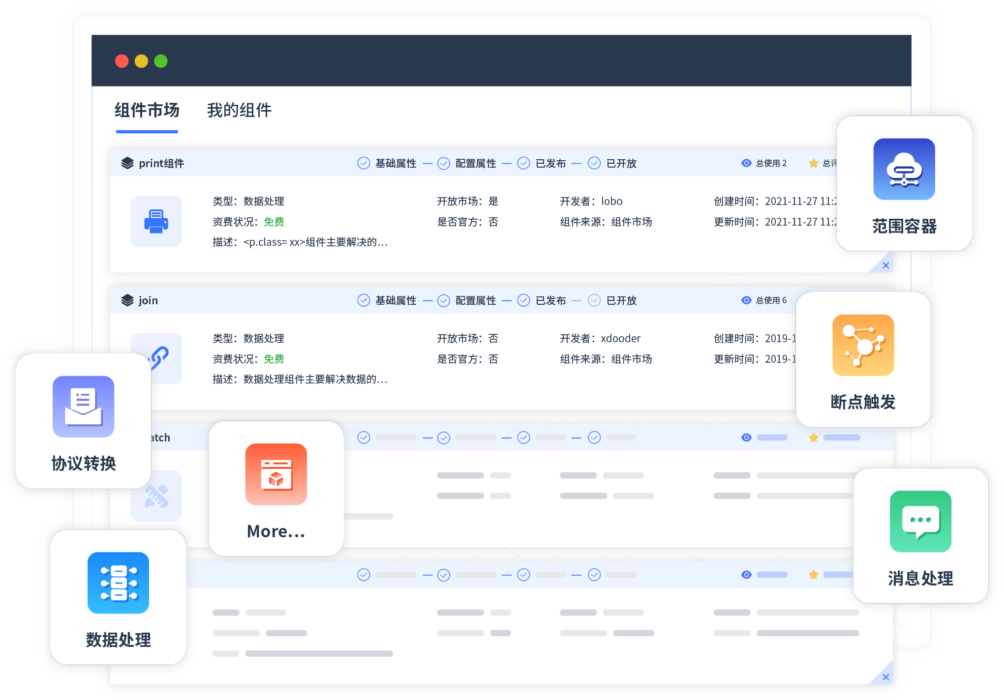 针对集成场景,,美团钱包商家版提供组件市场,,,,例如协议转换、、消息处理、、、、文件操作等。。。。除平台提供的组件外,,,客户可以自定义所需组件。。